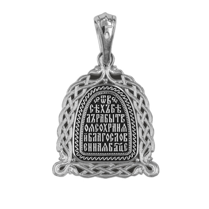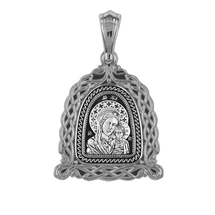 Description: Silver 925 oxidized. Prayer on the back in Slavonic - "Save thy servants from harm, O Most Holy Theotokos!" Blessed on a piece of the relics of Holy Great Martyr George.