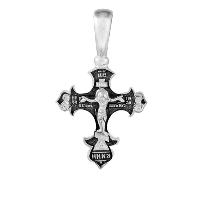 Description: Silver 925, oxidized. On the face of the cross - Our Lord's Crucifixion. On the back - St. Nicholas the Wonderworker. Blessed on a piece of the relics of Holy Great Martyr George.