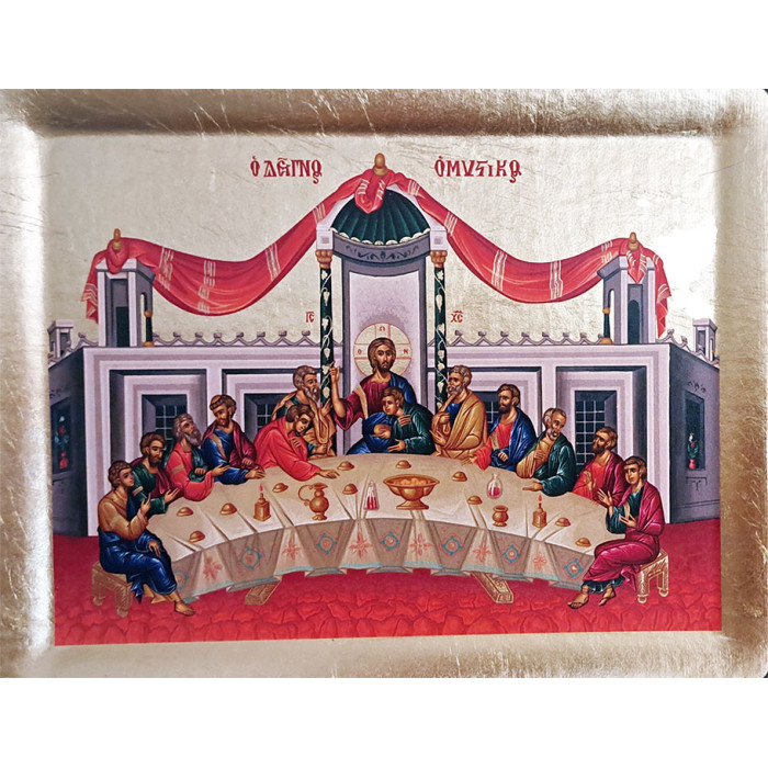 Description: Icon of The Mystical Supper. Produced with a detailed silk screen process using canvas and elegant gold leaf. Gift boxed and includes a stand. Made in Greece.
